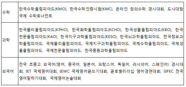 - 대회 명칭에 수학•과학(물리, 화학, 생물, 지구과학, 천문)•외국어(영어 등) 교과명이 명시된 학교 외 각종 대회(경시대회, 올림피아드 등) 수상실적