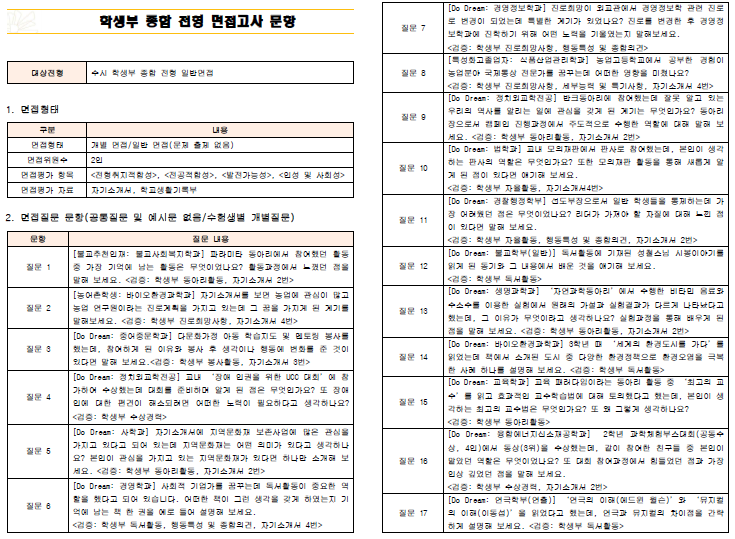 면접고사의 경우 면접의 형태와 면접 위원 수, 면접평가 항목 등이 기재돼 있어 동국대의 면접을 경험해보지 않은 수험생이라도 실제 면접이 어떤 형태로 이뤄지는지 대략적으로 추정할 수 있다. 수험생에게 주어진 개별 질문도 일부 예시로 제시돼 있다.