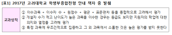 고려대 학생부종합전형 안내 책자에서는 크게 세 가지로 학생부종합전형에서의 교과 성적을 언급하고 있다. 특히 주목할 점은 ①과 ②의 '종합적 고려’와 '의지와 열정을 고려해 평가’라는 표현이다. 해석 여부에 따라서 주관이 많이 개입될 것으로 보이지만 다음과 같은 해석도 가능하다. 등급 상향과 하향의 정도가 의미 없는 것은 아니지만, 그 지표만으로 학생의 교과역량을 읽어내는 것이 아니라는 점이다. 더 나아가 '학생이 속한 집단’과 '처한 상황’, 그리고 '과목별 등급의 차이’, '이수자 수와 내용의 난이도와 같은 과목별 특성’ 등을 반영해서 우수함의 경중을 가리는 평가가 이루어지는 것이란 해석도 가능해 보인다.