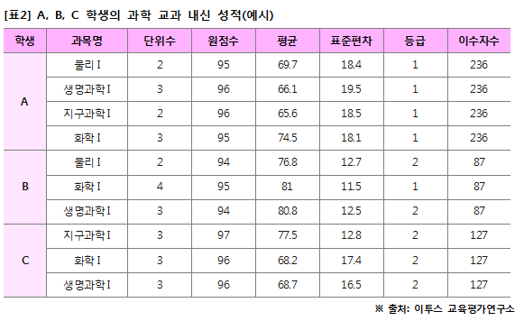 정량평가로 과학 과목의 내신만 계산해 본다면, A>B>C 순으로 우열이 가려진다. 학생부교과전형에 지원한다면 이 세 학생은 일부 전형을 제외하고는 그 합격 가능성을 가늠하기가 어렵지 않다. 하지만 이들이 교과 성적을 정성적으로 평가하는 학생부종합전형에 지원했다면, 쉽게 A>B>C순으로 우열이 가려진다고 답하긴 어렵다.