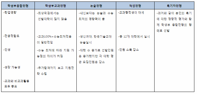 수시를 준비함에 있어선 전형요소 중 본인의 강점을 분석하고 동일한 전형이 있는 대학 위주로 지원전략을 수립하는 ‘선택과 집중’ 전략이 필요하다. 수많은 전형은 크게 다섯 가지 정도로 그룹화를 할 수 있다. 물론, 학생부종합전형의 경우에도 교과형인지, 순수 종합전형인지, 교과전형도 교과 100%인지 면접의 비중이 높은지에 따라 준비방법은 조금씩 다르겠지만 큰 틀에서는 각 전형별 특징이 명확하다. 아래를 살펴보자.