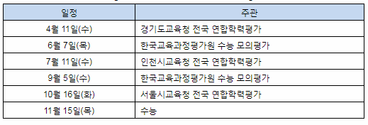 올해의 경우도 수능이 있기 전 6번의 학력평가와 모의평가가 실시된다. 이미 3월에 치른 경험이 있는 교육청 주관 학평의 경우 전국에서의 영역별 나의 위치를 판단할 수 있는 좋은 자료이고, 교육과정평가원 주관 모의평가의 경우 올해 수능의 출제경향과 난이도를 예측할 수 있는 중요한 시험이기에 시행월별로 꼼꼼히 준비하도록 하자.