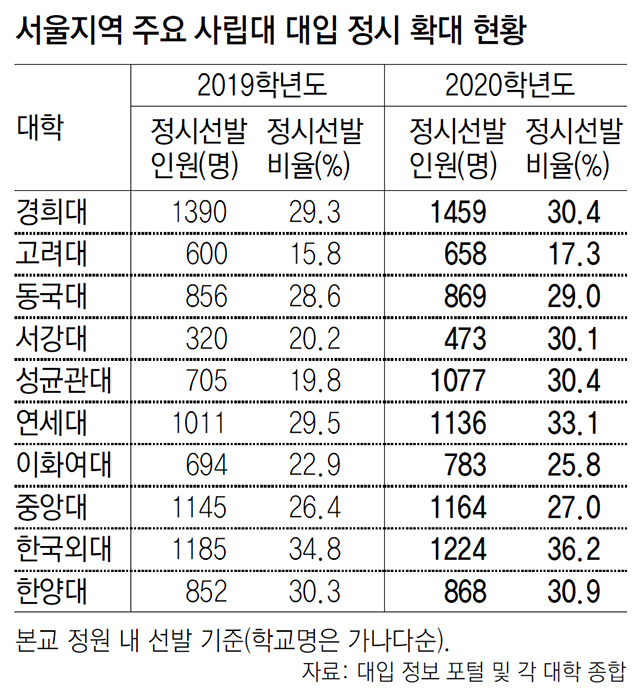고려 17%-연세 33%-成大 30% 등 교육부 확대 요청에 일제히 늘려 “강남 재학생-재수생 유리해질 것”
