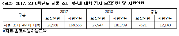 정시 경쟁 심화를 예측할 수 있는 근거는 또 있다. 바로 ‘재수생’의 증가다. 대입 사이클을 두 번 경험한 재수생들은 경험치 때문에 대입에서 좋은 성과를 거두는 경우가 많아 현역 수험생들에겐 두려움의 대상이다. 그런데 바로 이런 재수생들이 올해 크게 증가할 전망이라는 것. 2017·2018학년도 서울 소재 대학들의 모집인원과 지원인원을 비교해 보면 그 이유를 알 수 있다.