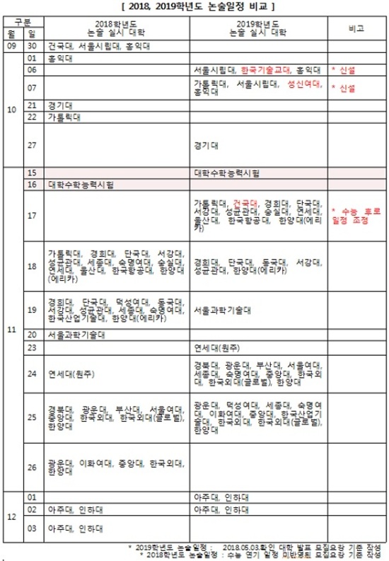 논술전형을 신설한 성신여대와 한국기술교대는 모두 수능 전 논술을 한다. 수능 전 논술을 실시한 대표적인 대학 중 하나였던 건국대는 2019학년도 논술을 수능 후에 실시한다. 가톨릭대(의예과 제외) 전년도와 비교하면 약 2주가량 논술 일정을 앞당겼다. 반면, 서울시립대(수능 전)와 경기대, 덕성여대, 세종대, 숙명여대, 한국산업기술대, 홍익대는 논술 실시 일정을 일주일 정도 늦췄다.