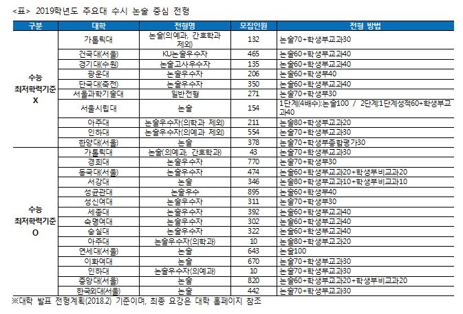 논술 전형에서는 논술 전형의 비중이 높은 편이다. 상위권 주요대를 중심으로 실시되는 논술 전형에서는 논술 성적이 60~80% 반영된다. 대부분의 대학은 논술 반영 비율을 작년과 동일하게 유지하고 있지만 올해 연세대(서울)의 논술 반영 비율은 크게 증가하였다. 연세대(서울)는 지난해에 논술을 70% 반영했지만 2019학년도 논술 전형에서는 학생부 성적 반영 없이 논술 성적을 100% 반영하며, 동점자 발생시에만 학생부 교과 성적을 활용한다. 가톨릭대는 논술 비율을 60%에서 70%로, 아주대는 70%에서 80%로 늘려 논술 영향력을 확대하였다. 성신여대는 올해 신설한 논술우수자 전형에서 311명을 선발하며 논술을 70% 반영한다.