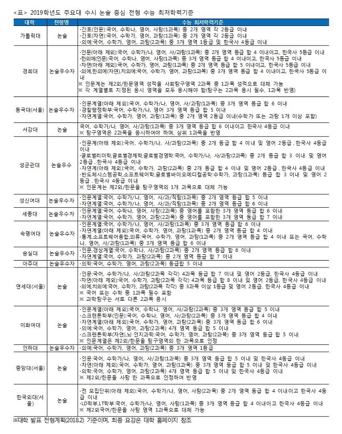 2019학년도에는 논술 전형 선발 인원의 70% 정도를 수능 최저학력기준을 적용해서 선발한다. 논술 전형에서 수능 최저학력기준 미적용 대학이 꾸준히 증가해왔지만 여전히 최저학력기준을 적용하는 선발 비중이 큰 편이어서 수능 성적이 우수하면 경쟁에서 우위를 차지하고 상향 지원도 가능할 수 있다. 수능 최저학력기준을 충족한다면 추가 합격 기회도 있으므로 논술 준비와 함께 수능에서 부족한 영역을 체크하여 성적을 올릴 수 있도록 영역별 학습 전략을 체계적으로 수립해야 한다. 논술 출제가 교육과정 내에서 평이하게 출제되는 경향을 보이면서 수능의 영향력이 더욱 늘고 있다.