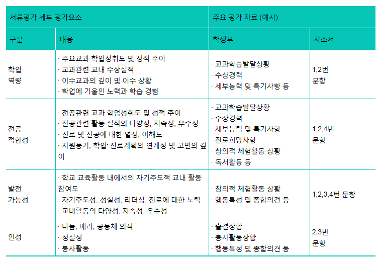 ② 서류평가 세부요소에 대한 학생부와 자기소개서 문항 구분