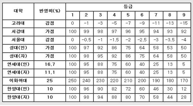 또 4개 영역을 모두 활용하는 경우에는 서울여대 인문계열, 성신여대 일부 학과가 영어 반영 비율이 30%로 높은 편이다. 영어 반영 방법에는 또 한 가지의 차이가 있는데, 이는 등급 간 점수 차이다. 1등급에 100점을 부여하는 대학의 점수차이를 보면 연세대와 숙명여대의 경우에는 1등급과 2등급의 차이가 5점이지만, 서강대는 1등급과 2등급의 차이가 1점, 성균관대(자연)과 한양대(자연)의 경우에는 동일 등급간 차이가 2점에 불과하다.